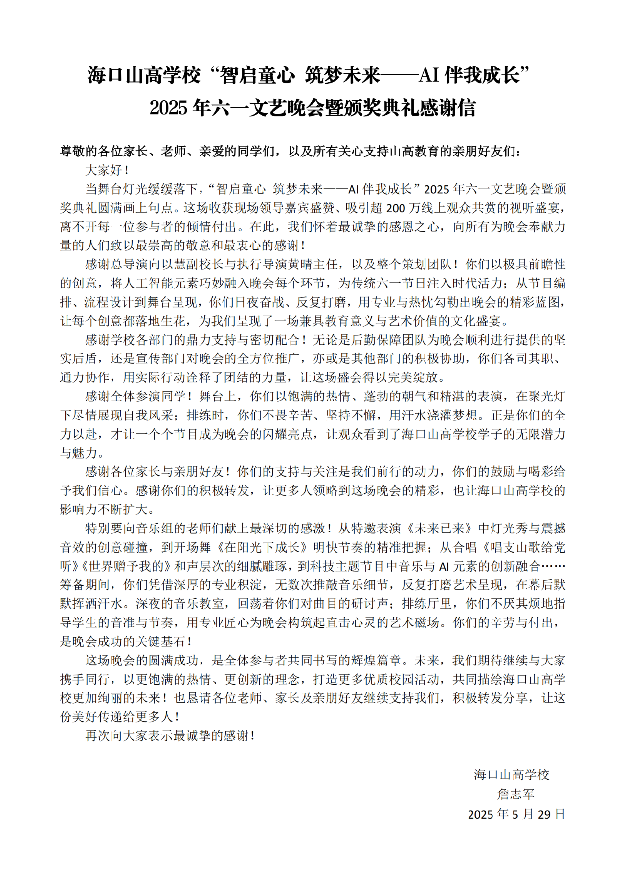 孩子們?cè)谖枧_(tái)上自信綻放,用精彩的表演點(diǎn)亮了這個(gè)屬于他們的節(jié)日之夜。晚會(huì)結(jié)束后,我們親愛的詹志軍校長滿懷感動(dòng)與欣喜,親筆寫下了飽含深情的感謝信。信中,校長高度贊揚(yáng)了小演員們的精彩表現(xiàn),肯定了全體教職工的辛勤付出,并向所有關(guān)心支持學(xué)校發(fā)展的朋友們表達(dá)了最衷心的謝意。這份感謝,是我們共同珍藏的六一記憶。