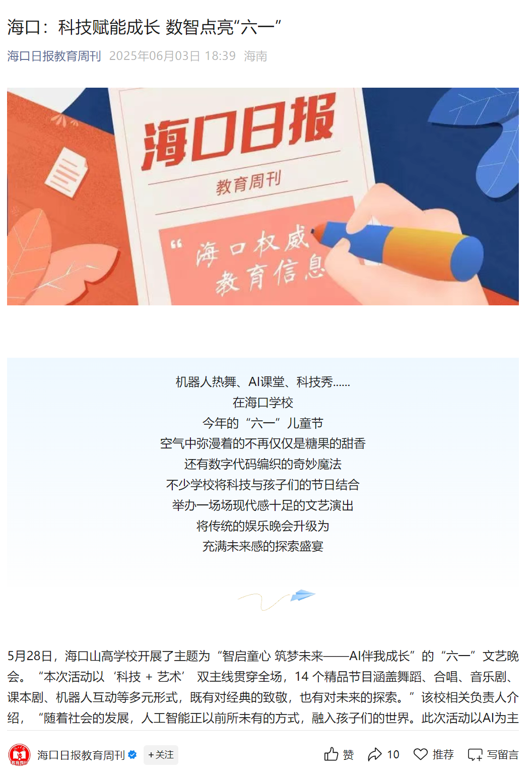 六月,是童年的搖籃,是夢(mèng)想的起點(diǎn)。在剛剛過去的兒童節(jié),??谏礁邔W(xué)校“智啟童心,筑夢(mèng)未來——AI伴我成長”2025年六一文藝晚會(huì),在全體師生、家長和社會(huì)各界的共同期待與見證下,璀璨綻放,并圓滿落下帷幕!