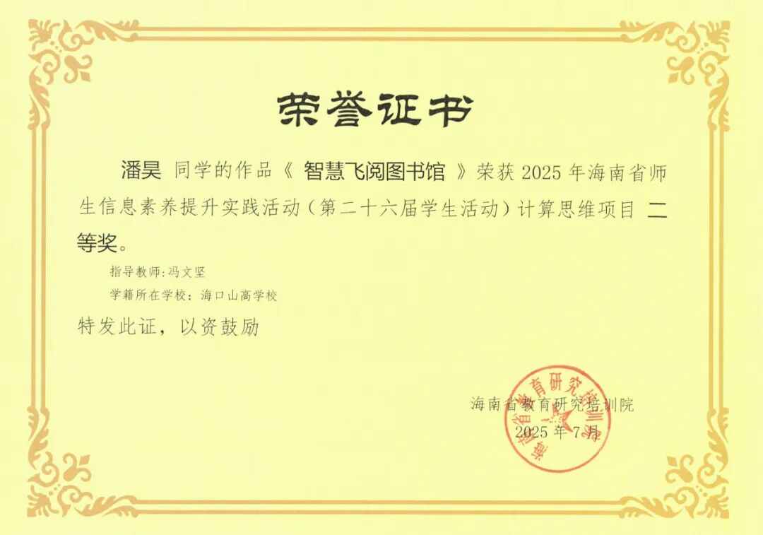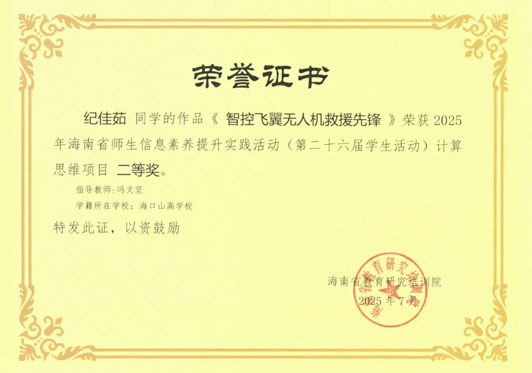近日,2025年海南省師生信息素養(yǎng)提升實(shí)踐活動(dòng)(第二十六屆學(xué)生活動(dòng))圓滿落幕。在這場(chǎng)全省范圍內(nèi)的高水平賽事中,我校學(xué)子與指導(dǎo)教師憑借扎實(shí)的知識(shí)儲(chǔ)備、出色的實(shí)踐能力和創(chuàng)新的思維方式,在計(jì)算思維項(xiàng)目中脫穎而出,一舉斬獲多個(gè)獎(jiǎng)項(xiàng),捷報(bào)頻傳,為校爭(zhēng)光!