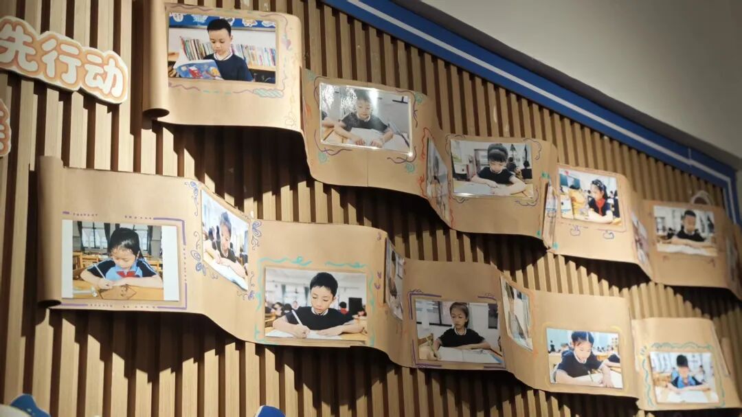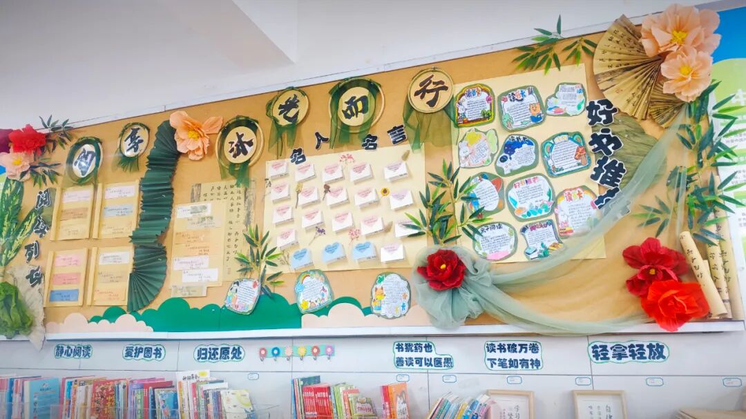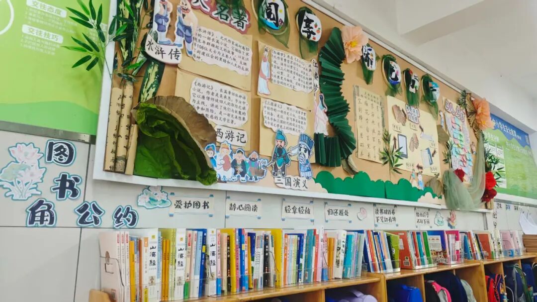 四年級主題是“閱享·沐光而行”,引導(dǎo)學(xué)生通過閱讀汲取智慧,在勞動中踐行所學(xué)。環(huán)境布置注重傳遞“從追光少年到發(fā)光未來”的成長理念,將個人成長與愛國愛黨情懷自然融合。