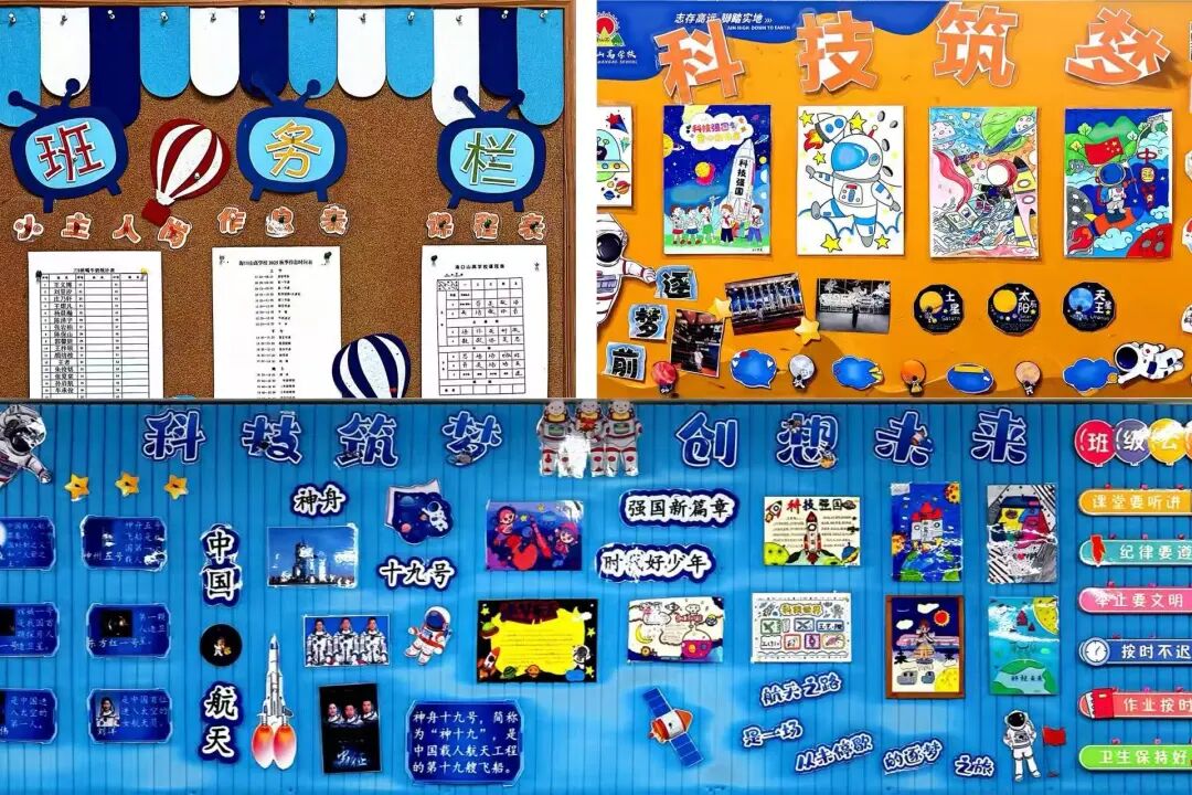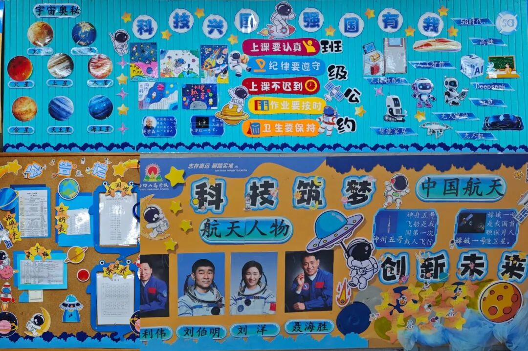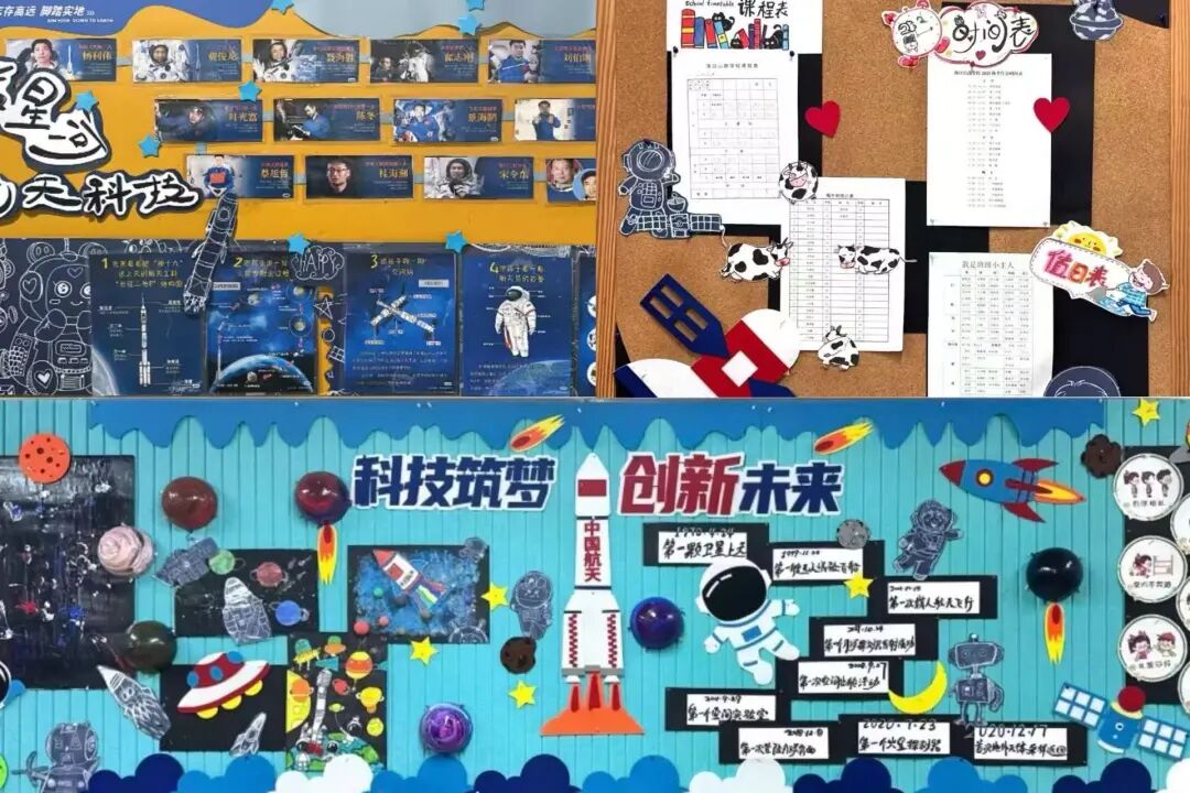 三年級以“科技筑夢、創(chuàng)想未來”為核心,打造沉浸式科技教室。學(xué)生自主創(chuàng)作的航天器模型細節(jié)滿滿,星空板報絢麗多彩,整體布置兼具知識性與互動性,激發(fā)學(xué)生探索熱情。